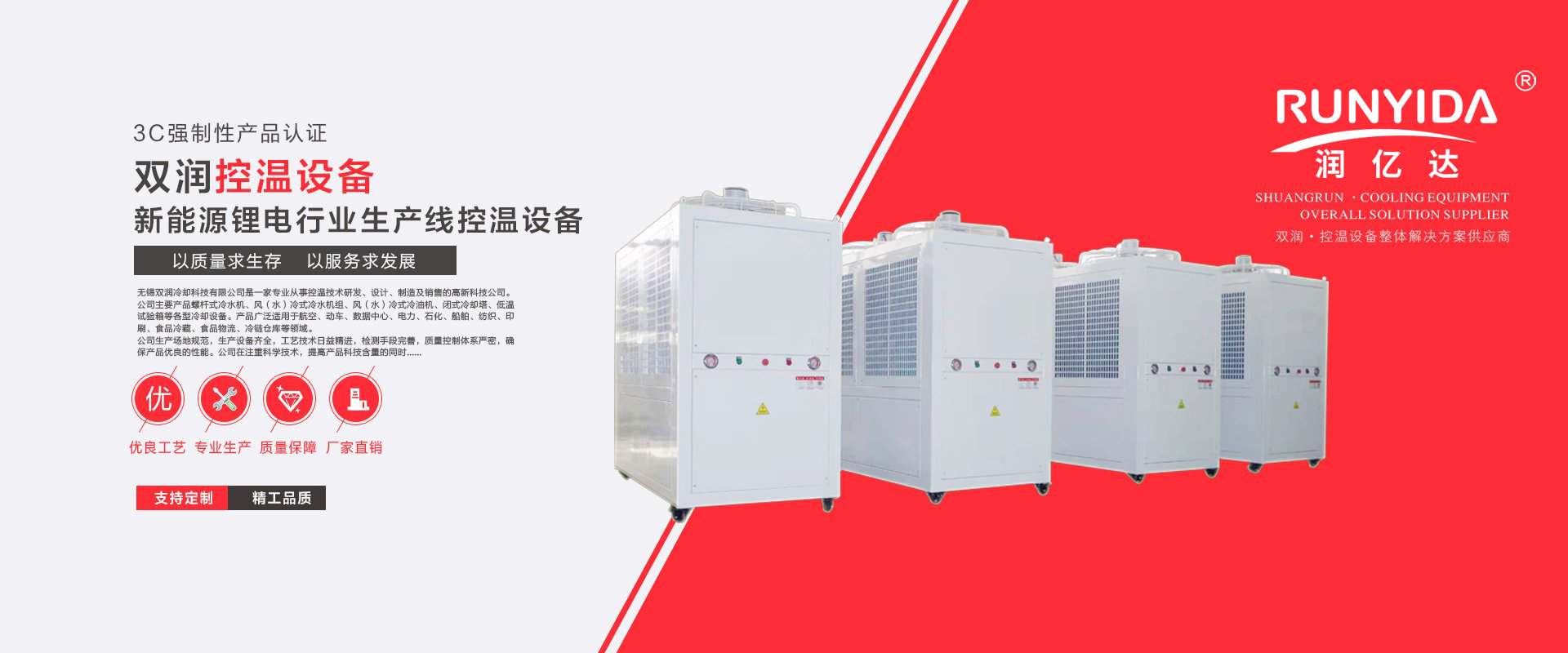 公司是一家致力于控溫技術研發、設計、制造的高新企業。公司主要產品包括螺桿式冷水機、磁懸浮冷水機、風(水)冷式冷水機組、風(水)冷式冷油機、閉式冷卻塔、低溫試驗箱等各類冷卻設備。產品廣泛應用于航空、動車、數據中心、電力、石化、船舶、紡織、印刷、食品冷藏、食品物流、冷鏈倉庫等多個領域。
